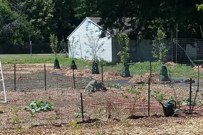 A new fruit tree orchard is in its early stages. Five apple trees are planted in a fenced-in area to protect them from deer. More trees will be added each year until the orchard is established. The fruit tree area is being developed in cooperation with the Horticulture Program.